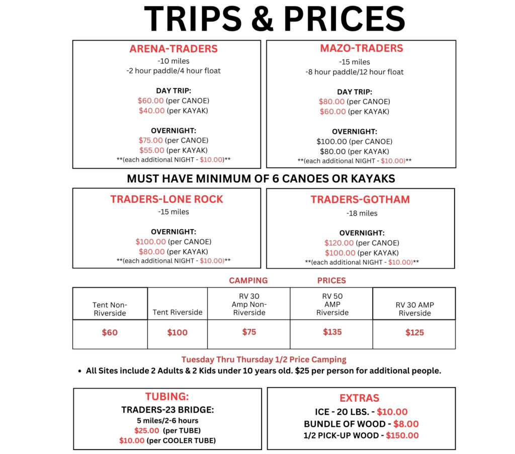 The latest drop-off time is 12:00 p.m. The latest pick-up time is 6:00 p.m. All drops-offs and pick-up dates and times need to be confirmed ahead of time. We will shuttle your canoe, your gear, and you to the drop off point. If you bring your own equipment and would like Trader’s to assist with drop-off or pick-up, please be sure to schedule ahead of time with Trader’s.